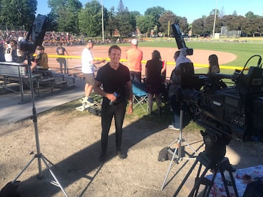 Will Aiello Will Aiello prepares for a live hit from Exhibition Park in Guelph at the 2022 Canada Celebration Tour softball game. (Dan Lauckner/CTV News)