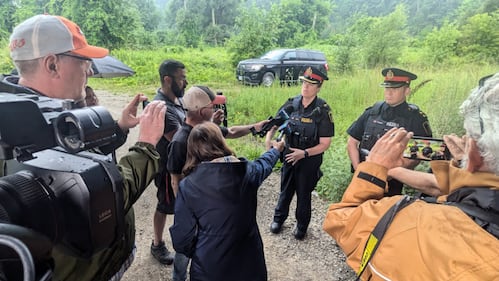 Grand River King Street Road East Kitchener Reporters at a Waterloo Regional Police press conference on two missing boaters on July 15, 2024. (Dan Lauckner/CTV News)