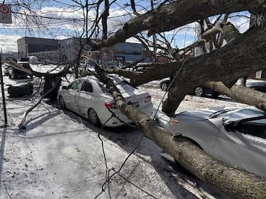 Montreal wind A huge tree falls on several cars in Montreal's Côte-des-Neiges—Notre-Dame-de-Grâce borough, Tuesday, March 17, 2026. (Kelly Greig/CTV News)