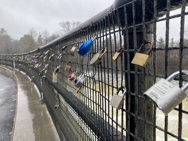 Hog's Back Falls Love locks adorn the fencing at Hog's Back Falls in Ottawa on Tuesday, April 14, 2026. (Kathryn McNicoll/CTV viewer)