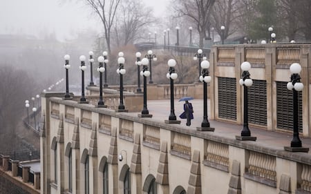 Spring in Ottawa People make their way on Parliament Hill as a heavy fog hangs over downtown Ottawa on Thursday, April 16, 2026. THE CANADIAN PRESS/Sean Kilpatrick