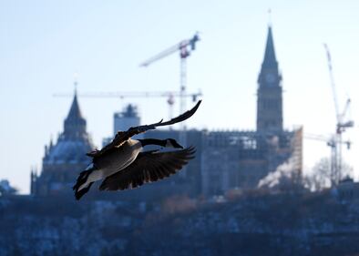 Spring in Ottawa A Canada goose comes in for a landing on a wall at the back of the Supreme Court of Canada building in Ottawa on Thursday, March 26, 2026. Parliament Hill is pictured in the background. THE CANADIAN PRESS/Sean Kilpatrick