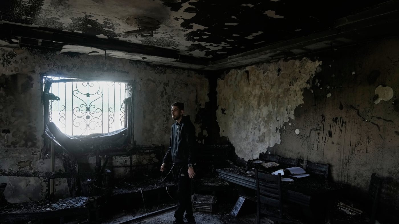 A Palestinian man inspects a torched house following Israeli settlers' rampage through nearby Nablus-area villages on Sunday night, in West Bank village of Deir al-Hatab, Monday, March 23, 2026. (AP Photo/Majdi Mohammed)